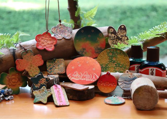 牛革に刻印で模様を打ちつけてから色をぬります。