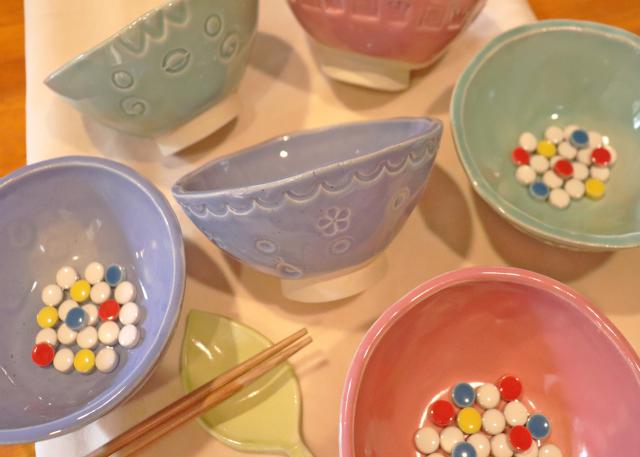 板状の粘土からオリジナルのお茶碗を作ります。スタンプ等で自由に模様をつけたら完成。お茶碗の色(釉薬)はピンク、ライトグリーン、ラベンダーの3色から選ぶことができます。作品は焼成後、後日のお渡しです。