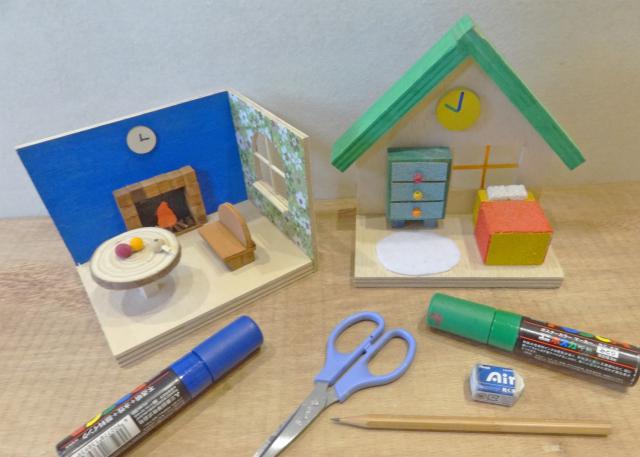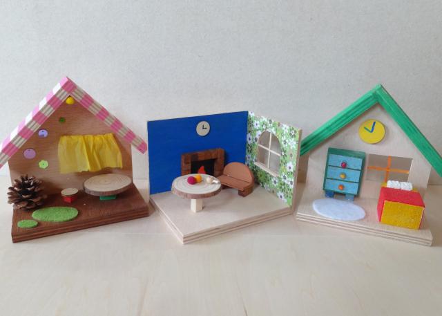 お家の土台を選び飾りの材料をえらんでボンドで組みたてます。ステキなお家やお部屋を作る事ができます。