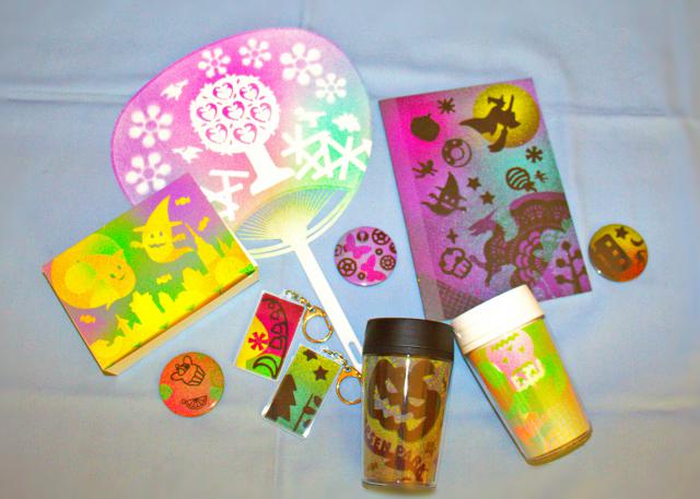 専用のアミとブラシで、スパッタリングの技法を体験します。カラフルな色とモチーフでグッズを作ります。