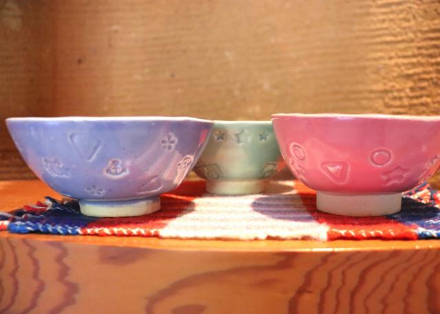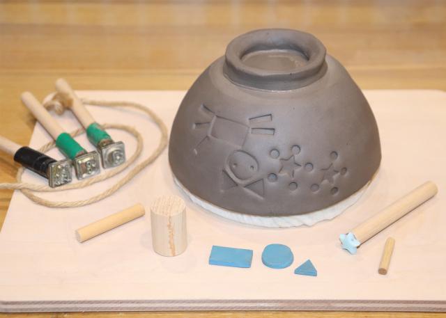 板状の粘土からオリジナルのお茶碗を作ります。スタンプ等で自由に模様をつけたら完成。お茶碗の色(釉薬)はピンク、ライトグリーン、ラベンダーの3色から選ぶことができます。作品は焼成後、後日のお渡しです。