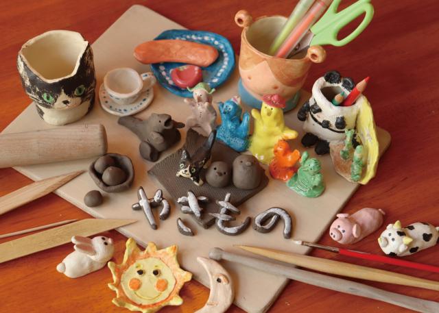陶芸用の粘土と絵の具で自由に作品をつくります。箸置きやミニチュア小物、オブジェや植木鉢など様々な作品づくりに挑戦できます。