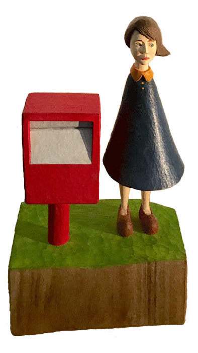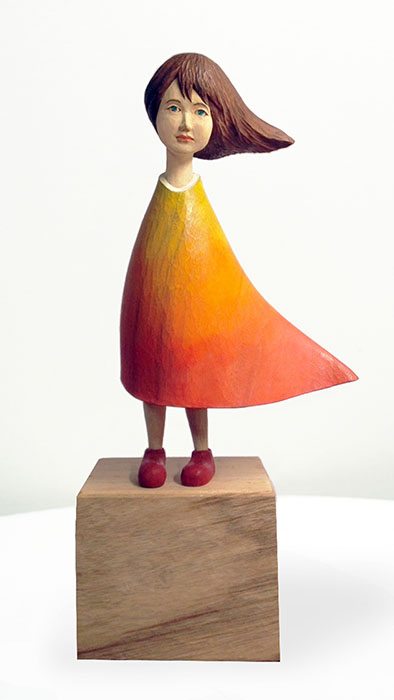 素材である楠の丸太のねじれや反った形が子どもの立ち姿に見えたことから、子どもをモチーフに制作をしています。手が無い状態なのは、子どもの「言いたいのに言えない」気持ちを表しています。恥ずかしいのか、悲しいのか、怒っているのか、寂しいのか、上手く言葉にできない自分の本当の気持ちを隠すように、手もどこかに隠してしまうようです。子どものどこか遠くを見つめる儚い表情や佇まい、純粋な感情を形にできたらと思います。